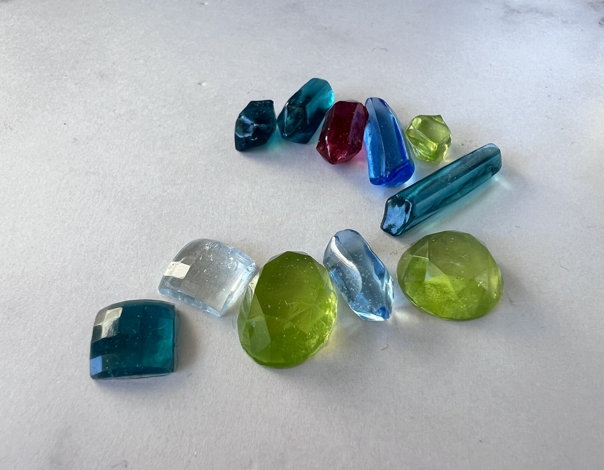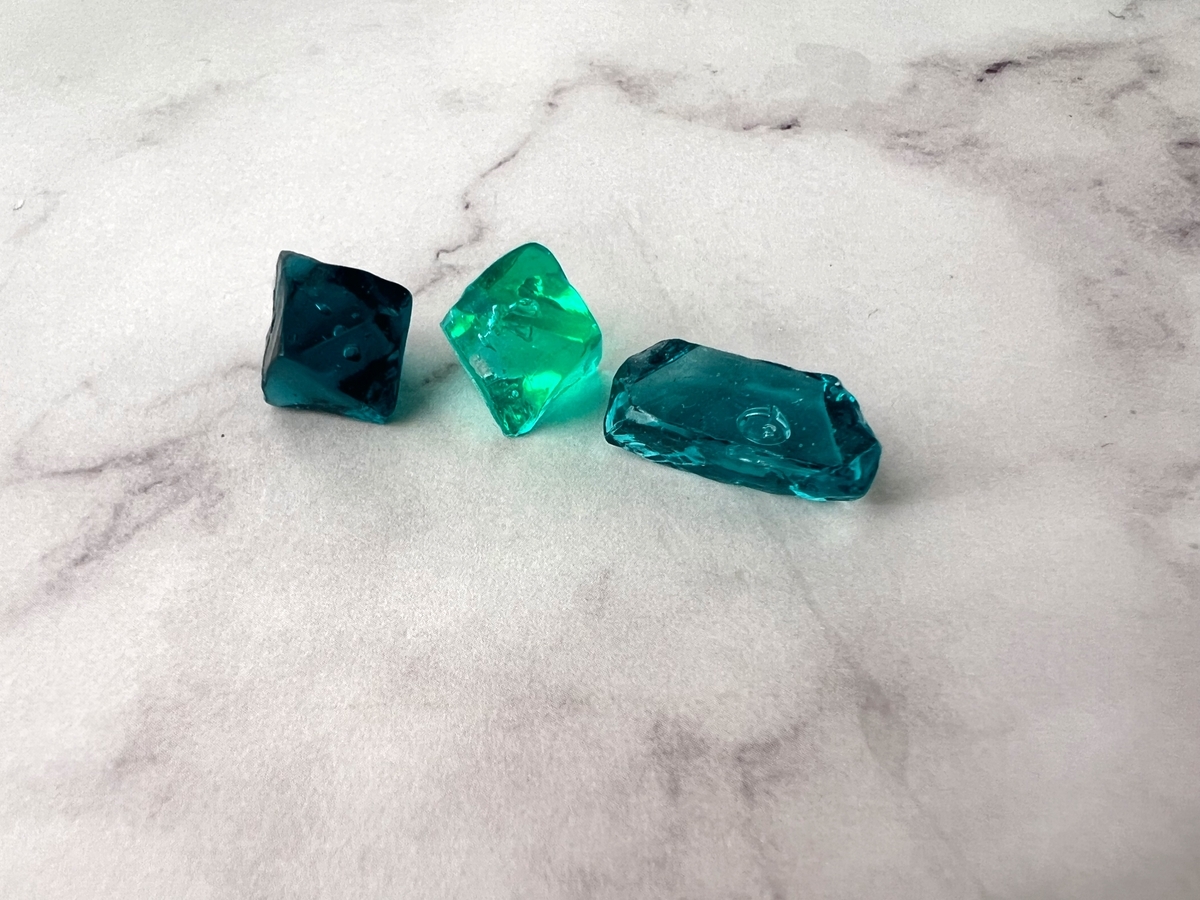 気を取り直して。こうして改めてほんものの鉱石を見ると、透明なだけじゃなくて、白っぽく濁っていたりするんですよね。前回、気泡を抜くことに注力し全然うまくいかずに落胆してました。でも鉱石に詳しい友人に、鉱石には気泡とか不純物とか、そういうのが混ざっているものだと教えてもらい「確かに…‼︎」と思いました。無理に気泡抜かなくても良いのか。そして透明の中に、そういう白っぽい部分とかも入れてみても良いかもしれない。それで、グラデーションにして、キラキラも混ぜて…。
