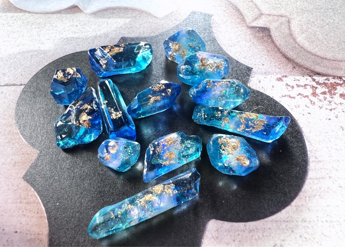 ほんものの鉱石じゃないレジン鉱石の強み。それはやはり、アレンジにより自分好みの石が作れる点にあるのではないかと思いました。色の濃さを変えるのも、見る角度によって色を変えることも、きらめきを加えることも、全部思いのまま。なんて考えると、とてもとてもワクワクして来ました‼︎