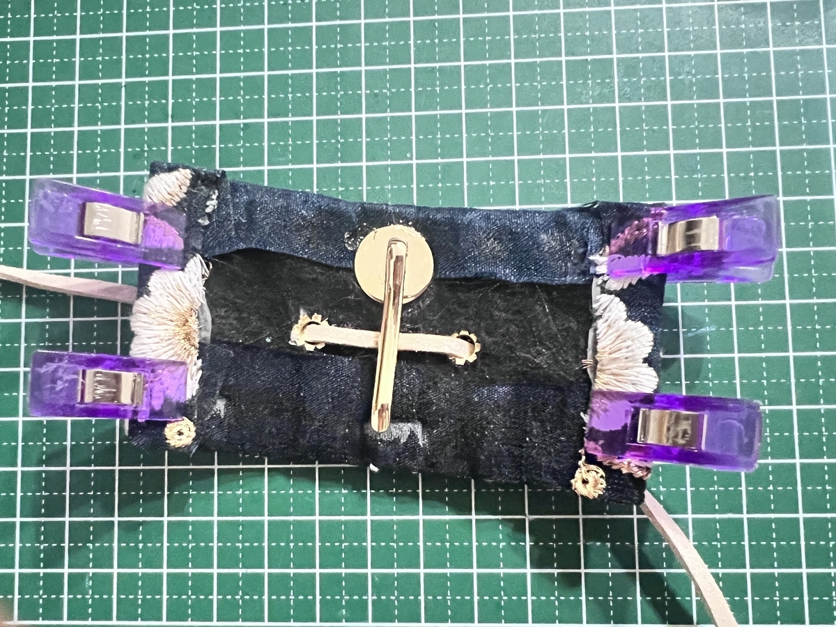 リボンを切って、フェルトを貼って、ハトメを付けて、紐を通して、裏地を貼って、ポニーフックパーツを付けて、ひたすらチクチク手縫いして、
