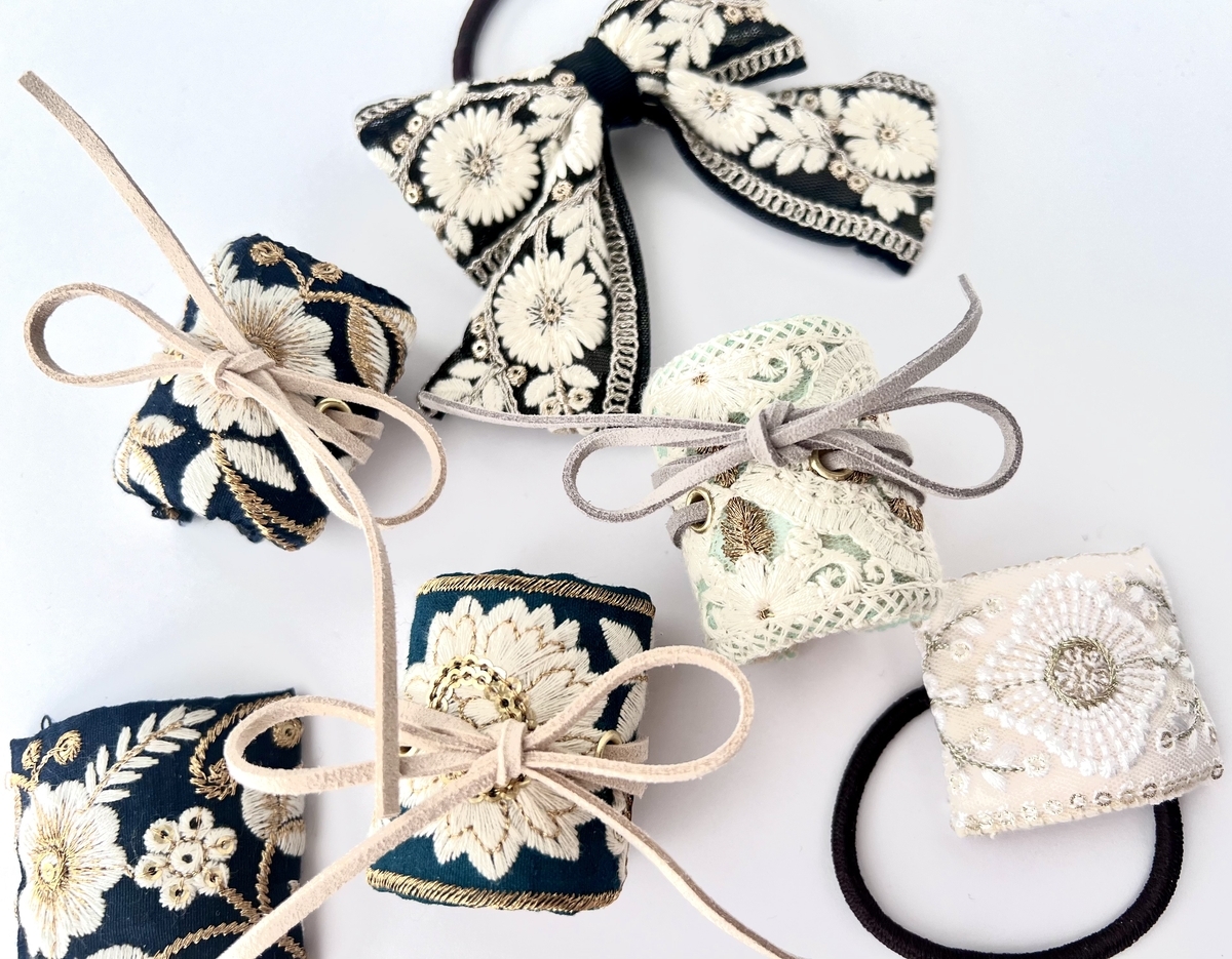 あぁ、もっともっと、色んな色のインド刺繍リボンが欲しいなぁ。表のリボンの色が暗いのに裏地の合皮が明るい色だと縫い糸が目立つんだなぁ、暗い色の裏地も欲しいなぁ。そもそも刺繍糸、黒と白しか持ってないけどもっとリボンに合った色が欲しいなぁ。え、糸って太口と細口があるの?どっちもいるじゃん。ヘアゴムとかバレッタとか、他にも色々作ってみたいなぁ( ^∀^)