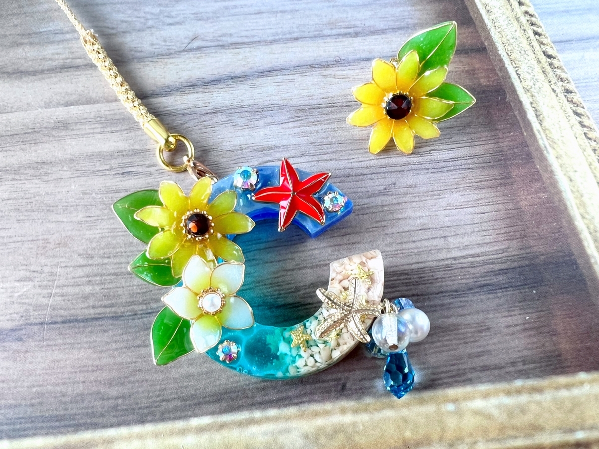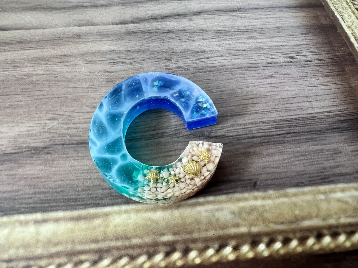 元々は、このセレスタイトのアクセサリーが欲しくて鉱石レジンに挑戦したのが始まりでした。あの頃は、着色剤をちょっとだけ混ぜるとか、モールドのフチより少なめにレジン液を入れるとか、そういう小ワザを全く知らなくて、ものすごい残念なただのゴミを生み出してしまったりしました…懐かしいです笑